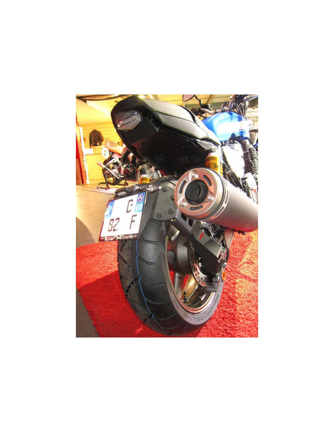 Le support de plaque déporté « ras de roue » Access Design est un accessoire de personnalisation incontournable. Que ce soit pour donner un aspect futuriste, ou renforcer l’aspect Vintage de votre moto, il ne fait aucun doute qu’il rendra votre machine unique ! Support cintré pour un alignement parfait avec le pneu arrièreDesign « ras de roue » uniqueFixation renforcée pour limiter les vibrationsEnsemble du support recouvert de peinture époxy noir mate pour un aspect agressifLivré avec éclairage de plaque LED homologué, connectiques et notice de montageDéveloppé et fabriqué en France Caractéristiques techniques : Fixation en acier 5mm sur l’axe de roue arrièreBras de support de plaque cintré en aluminium 5mmSupport de plaque en aluminium 3mmOrifices pour fixation plaque d’immatriculation, clignotants et éclairage de plaque