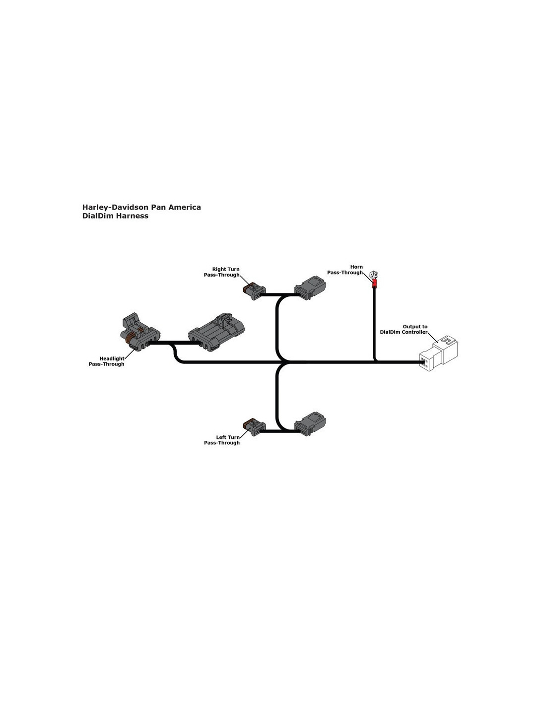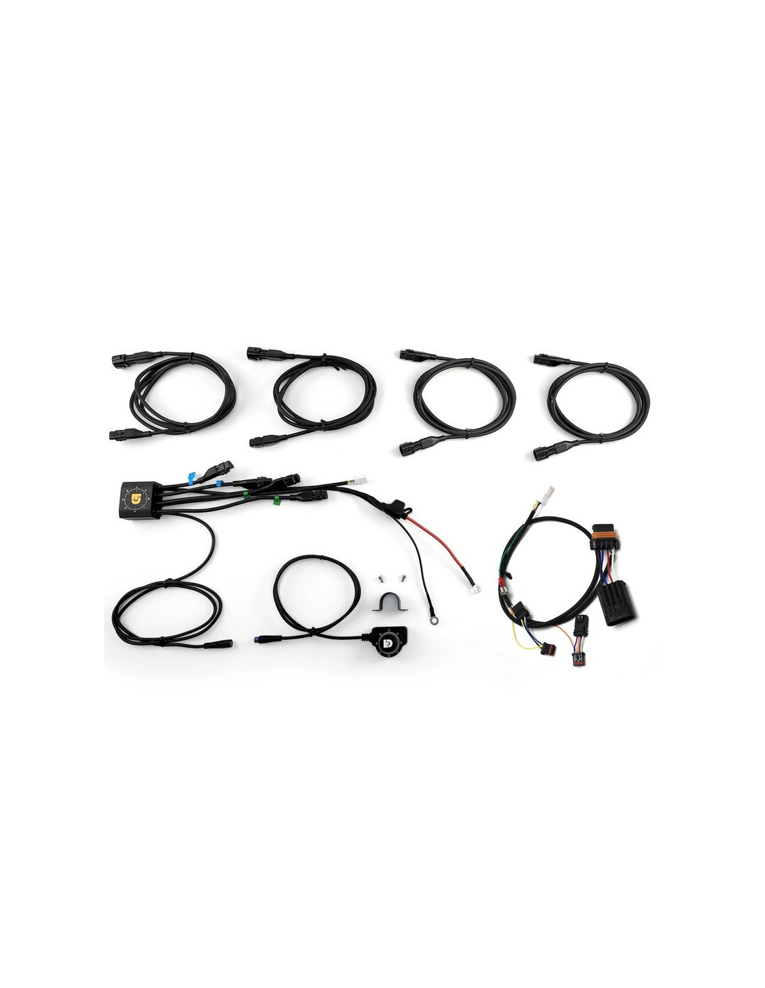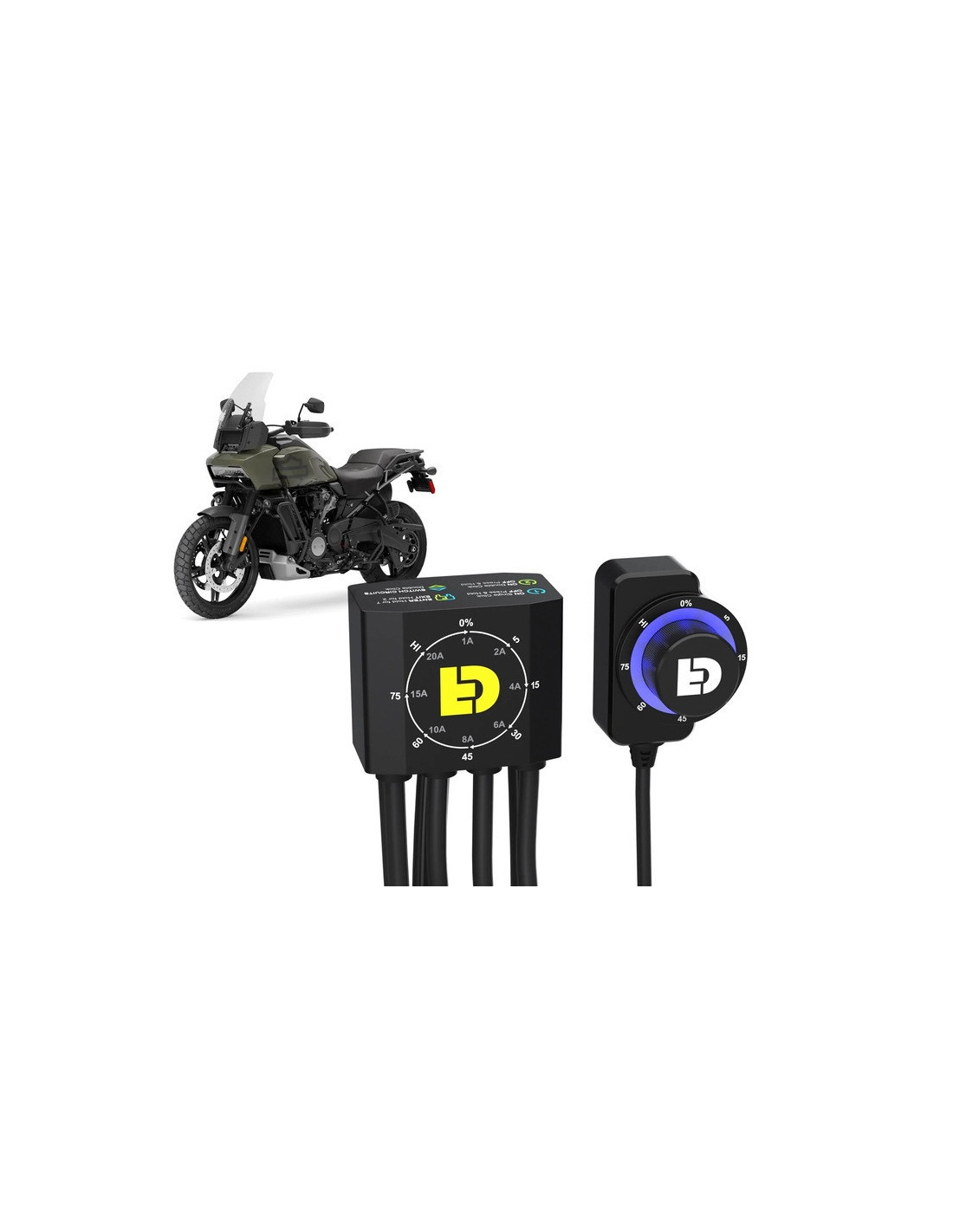 Cet ensemble de produits pré-configurés comprend le contrôleur d'éclairage DialDim standard et un faisceau de câblage plug-&-play pour Harley-Davidson Pan America. Le faisceau spécifique au véhicule se branche simplement sur les connecteurs des phares, du klaxon et des clignotants Pan America pour activer des dizaines de fonctions et de réglages d'éclairage utiles !